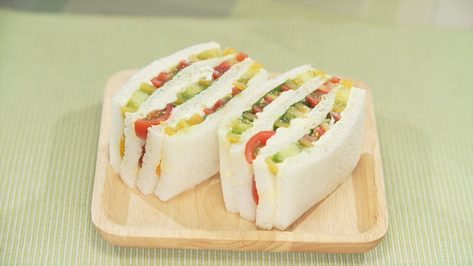- バターを塗った面にバジル、2種類のトマト、モッツァレラチーズの順にのせ、マヨネーズを適量かけてパンを重ねる。