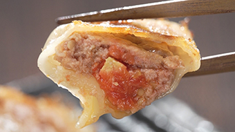 中火で焼き、餃子の底に薄く色がついたら水を入れ、蓋をして弱火で3分蒸し焼きにする。 - 蓋を開けて水分が飛んだら、仕上げ用のゴマ油を回し入れて焼き色を付ける。