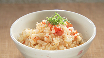 - 炊きあがったら、ちりめんじゃこを入れてトマトをつぶしながら混ぜる。