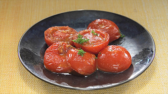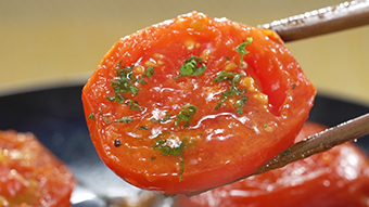 - フライパンにオリーブオイルを中火で温め、トマトの断面を下にして並べる。
