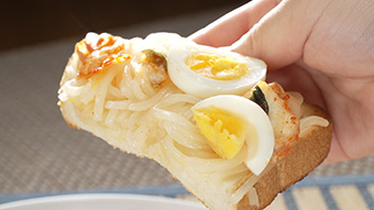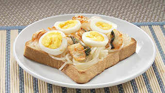 麺に付属の冷麺ダレと水を加えて和え、半量ずつ食パンにのせる。 - キムチとゆで卵をのせ、250℃のトースターで約4分焼く。