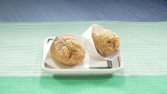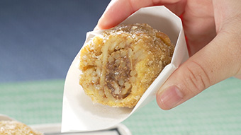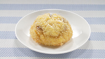 - 小麦粉、卵、パン粉の順に付け、170℃の油できつね色になるまで約1分揚げる。