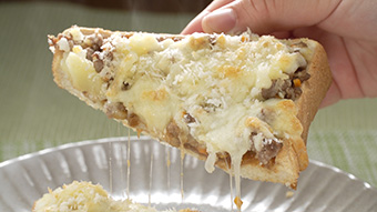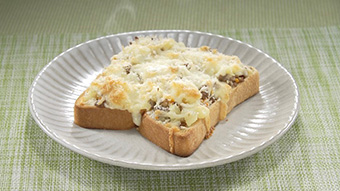 - 食パンに中濃ソースを塗り、コロッケのタネ、ピザ用チーズをのせ、パン粉を散らす。