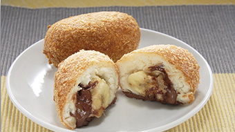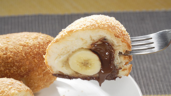 - 生地にチョコレート、くるみ、バナナをのせ、ラップを使いながらバナナを包む。