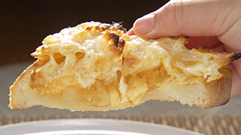 - 食パンにバターを塗り、ポテトチップス、ピザ用チーズをのせ、マヨネーズを細く格子状にかける。
