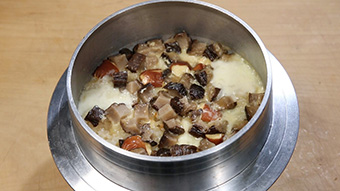 - 炊飯器の釜に浸水して水気を切った米の上にモッツァレラチーズを手でちぎってのせ、水、豆乳、しょっつるを入れて軽く混ぜる。