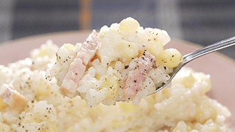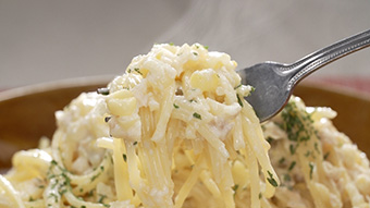 - 粉チーズを加えてさらに1分煮詰めたら、ツナ、とうもろこしペースト、とうもろこしを入れて混ぜ合わせる。