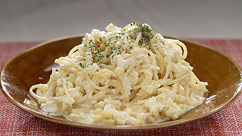 - 鍋に湯を沸かし、塩を加えてスパゲッティを表示時間通り茹でる。