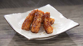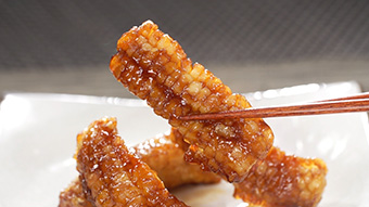 揚げた時にはねるのを防ぐため、実に縦に切り込みを入れる。 - 袋に入れ、片栗粉を加えて振りまぜ、170℃の油で3分ほど揚げる。