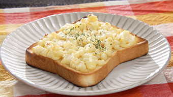 - ボウルにとうもろこし、マヨネーズ、しょう油、粗挽きコショウを入れたらよく混ぜ、食パンにのせてマヨネーズをかける。