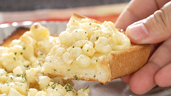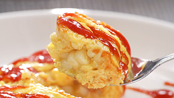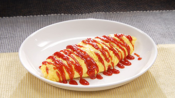 - フライパンにバターを引き、卵液を入れてかき混ぜながら加熱し、半熟になったら半分に折りたたみ、中火で焼く。