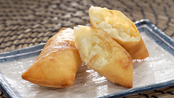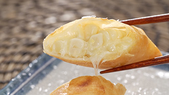 - 春巻きの皮に、コーン、半分におったチーズ、コーンの順において包み、水溶き小麦粉でとめる。