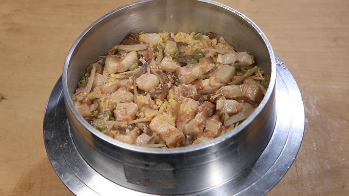- 炊飯器の釜に浸水して水気を切った米、浸したとうきびこざねを汁ごと加え、ごぼう、豚バラ肉、氷を加えて炊く。