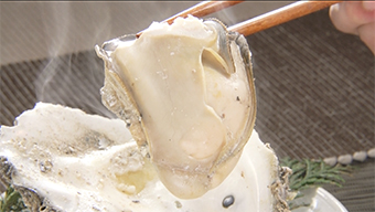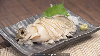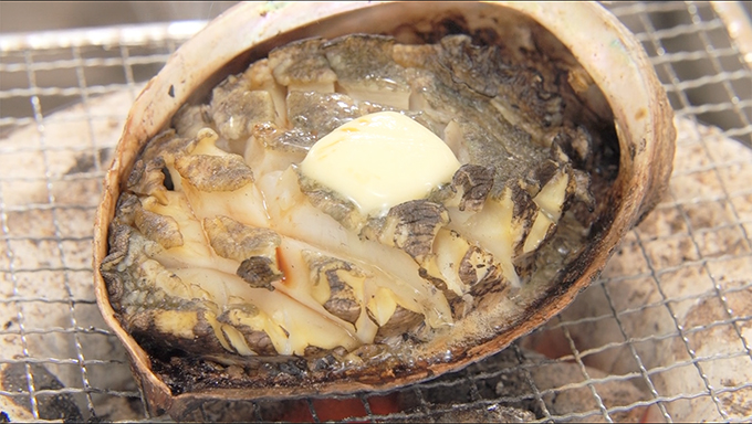 - アワビの身にさいの目に切り込みを入れ、網の上にのせて身が乾き、縮んでくるまで15~20分焼く。