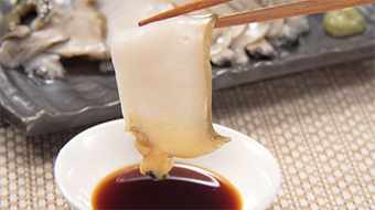 - 水気を拭き取り、薄く(2~3mm)スライスしたらツマをのせた殻の上に盛り付ける。