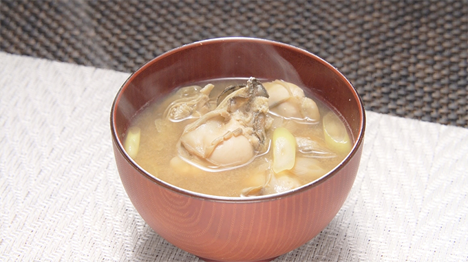 長ネギは斜め薄切りにする。 - 鍋にかつおダシだしを入れて中火にかけ、沸騰したらカキを入れ、アクを取りながら中火で3分煮る。