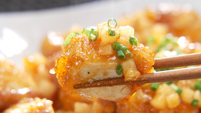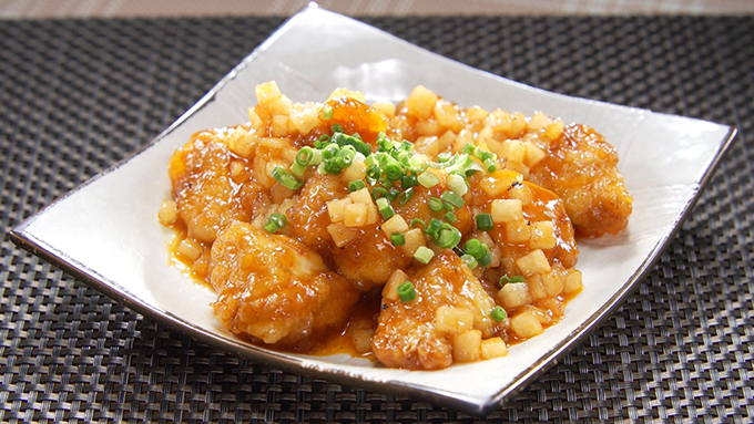 - ボウルに梨、コチュジャン、ゴマ油、粗挽きコショウを入れて混ぜ、揚げ焼きした鶏肉を加えて絡める。