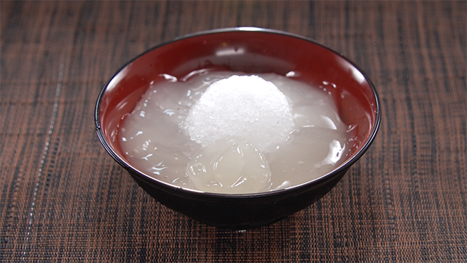 そのまま5分程冷やす。 - 器にかき氷を平らに盛り、その上へわらび餅をそっと盛り付け、黒蜜を添える。