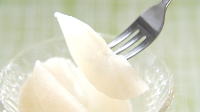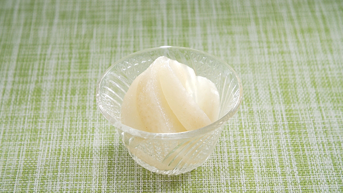 - 梨は皮をむいて芯を取り、16等分に切る。