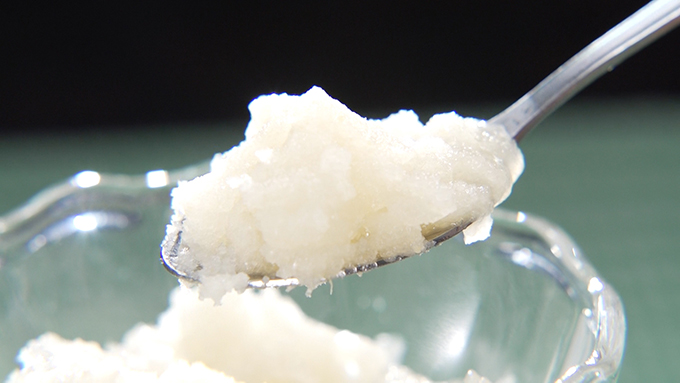 - しゃもじですくって落とした生地が、糸を引くように伸びるかたさになるように仕上げる。