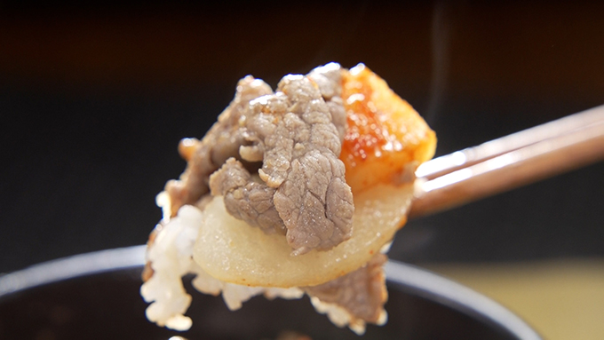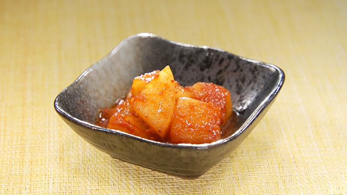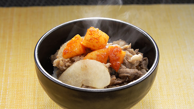 薄切りの梨を加え、1分炒めて火を止める。 - ごはんの上に盛り、梨キムチをのせる。