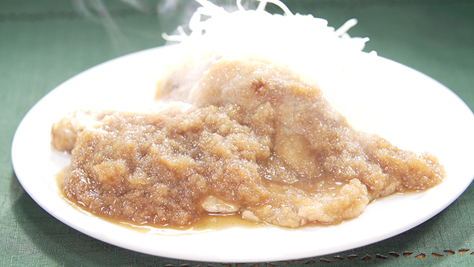 - 梨は皮をむいて芯を取り、半分は2mm程度の薄切り、半分はすりおろす。