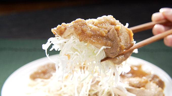 - キャベツを盛った器に豚肉をのせ、タレをかける。