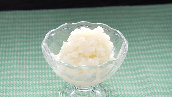 - 梨のコンポートをミキサー等でピューレ状になるまで攪拌し、バットに入れて冷凍庫で約2時間凍らせる。