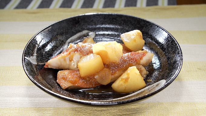 しょうがは薄切りにする。 - フライパンにすりおろした梨、水、酒、しょう油、しょうがを入れて中火にかけ、煮立ったら金目鯛と切った梨を入れ、落とし蓋をして5分煮る。