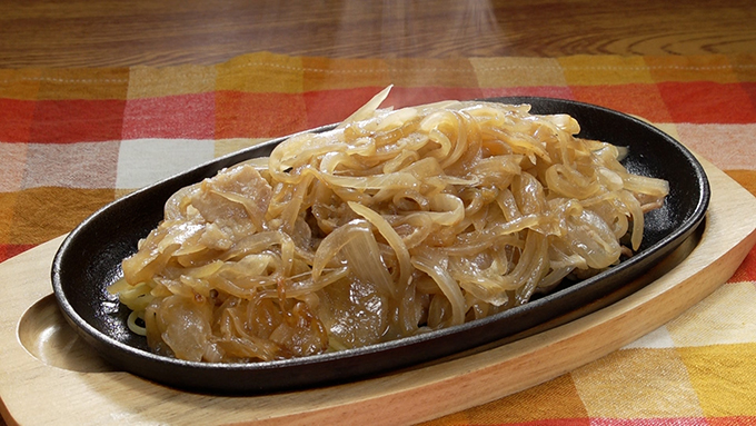 にんにくはすりおろす。 - 鉄板に炒めパスタとピーマン素揚げ、じゃがいも素揚げ、さつまいも天ぷら、にんじんグラッセを盛り付けておく。