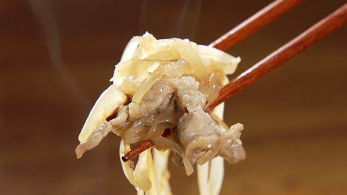 牛肉は大きければ切っておく。 - フライパンにめんつゆ、水、砂糖を入れてひと煮立ちさせ、新玉ねぎと牛肉を入れる。