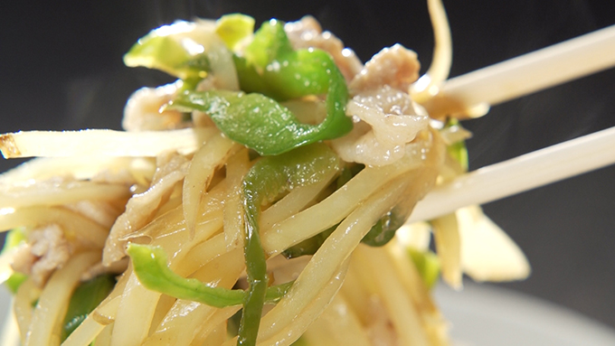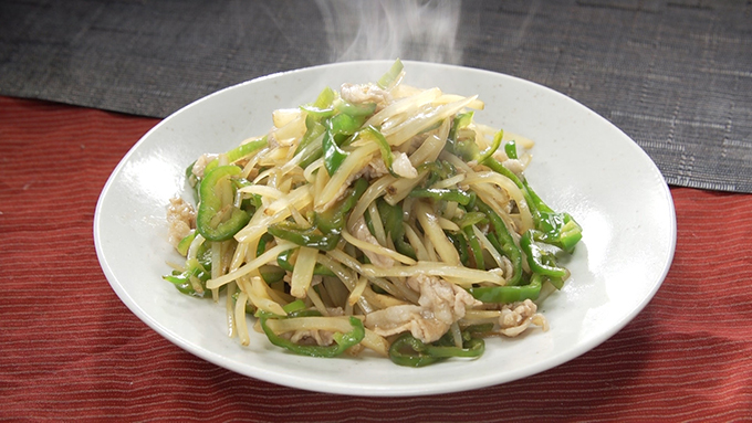 - 同じフライパンにピーマンを入れて炒め、豚肉、じゃがいもを加え、合わせ調味料を入れてひと炒めする。