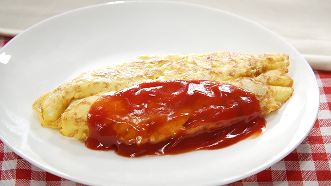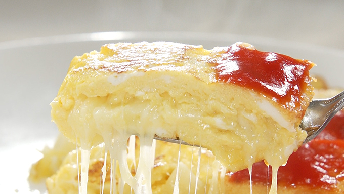 - ゴムベラで中央を軽くまぜ、手前半分にチーズを入れて半分に折る。トマトケチャップをかける。