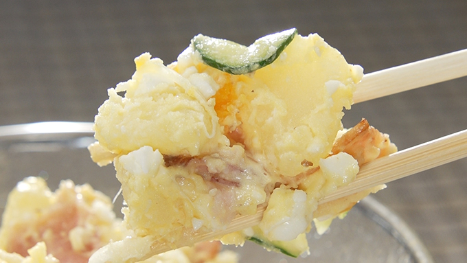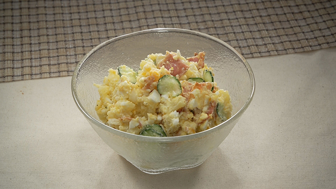 - 湯切りしたじゃがいもにベーコン、ゆで卵の黄身と白身、玉ねぎ、きゅうり、