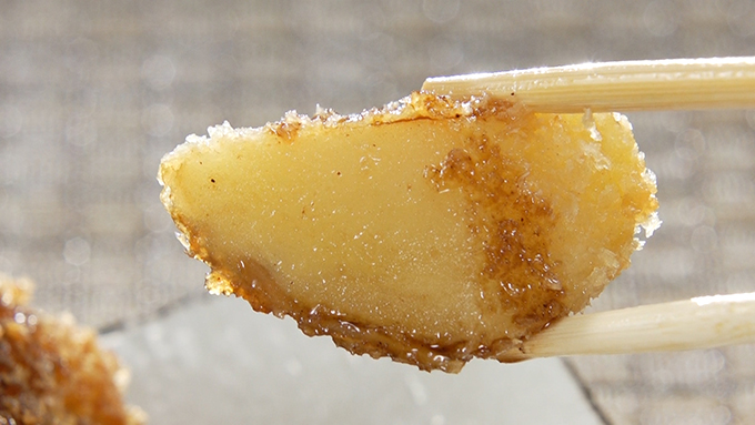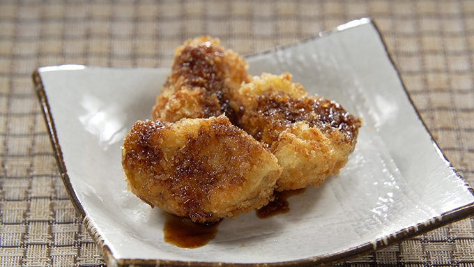 ざるにあげて水気を切り、塩、コショウをふる。 - 薄力粉、溶き卵、パン粉の衣をつけ、180℃の油で1分ほど揚げる。