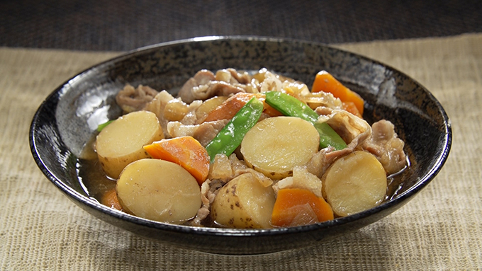 じゃがいも、にんじん、玉ねぎ、豚バラ肉を入れる。 - 火をつけずに具材をつゆにほぐし、キッチンペーパーの真ん中に穴をあけて落し蓋をする。