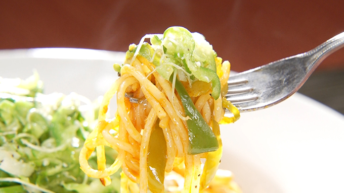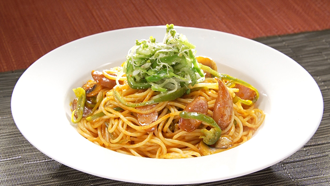 オリーブオイル、パルメザンチーズを加え、もまないように和える。 - ナポリタンにピーマンサラダをのせ、粗挽きコショウを振る。