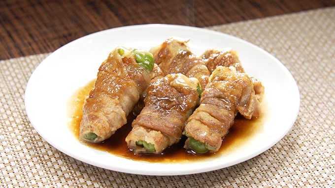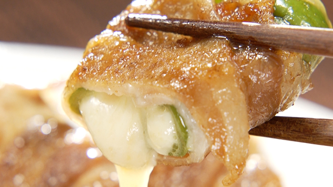 - ピーマンにピザ用チーズ(1個10gを目安)を詰め、豚バラ肉を巻き付ける。