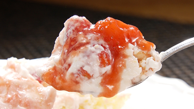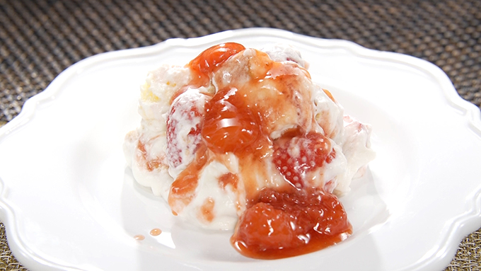 いちごのソースを加え、マーブル状を残すように軽く混ぜる。 - 器にケーキを盛り、いちごのソースをかける。