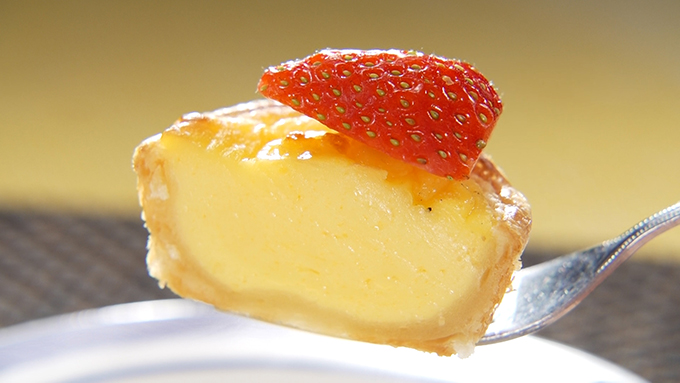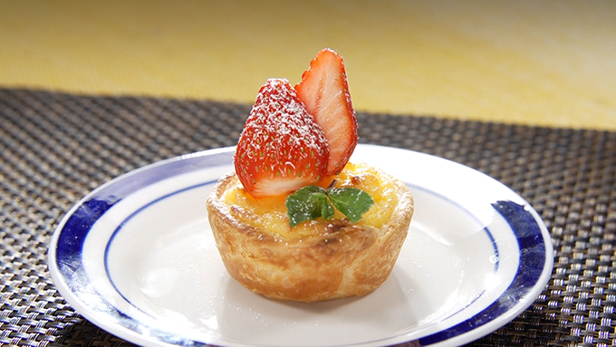 - エッグタルトの上に縦半分に切ったいちご、ミントをのせ、粉糖をふる。