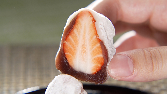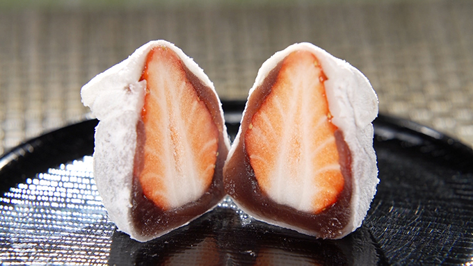 - 【1】に茹でたしゃぶしゃぶ用餅をのせ、こしあん、いちごをのせる。