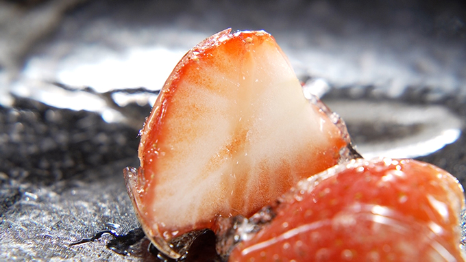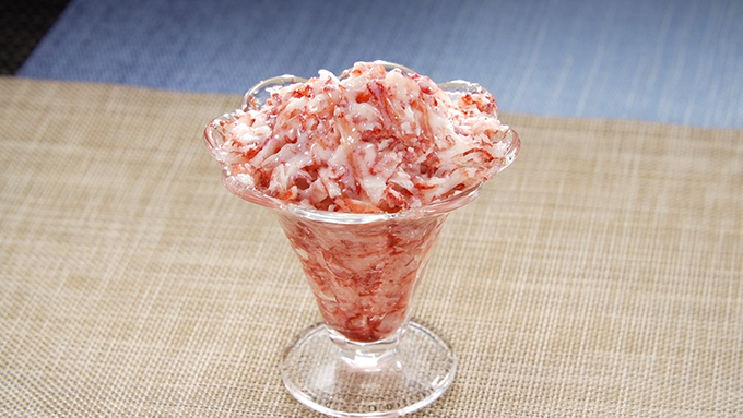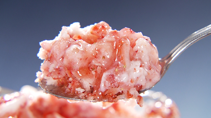 いちご、砂糖をブレンダーに入れて撹拌する。 - 器にいちごシロップを入れる。冷凍いちごを専用の機械またはかき氷機に入れて削る。