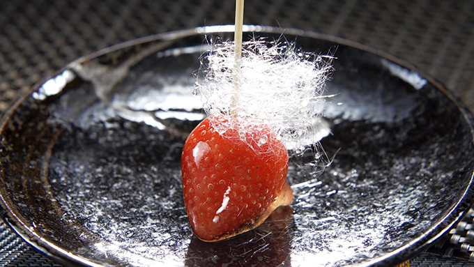 飴をスプーンで軽く掬い、手首のスナップをきかせて振る。手でやさしく丸める。 - いちご飴に飴の糸をのせる。