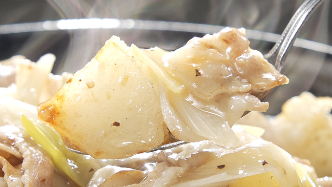 - 別のフライパンにバターと豚バラ肉を入れ、キツネ色になるまで焼く。