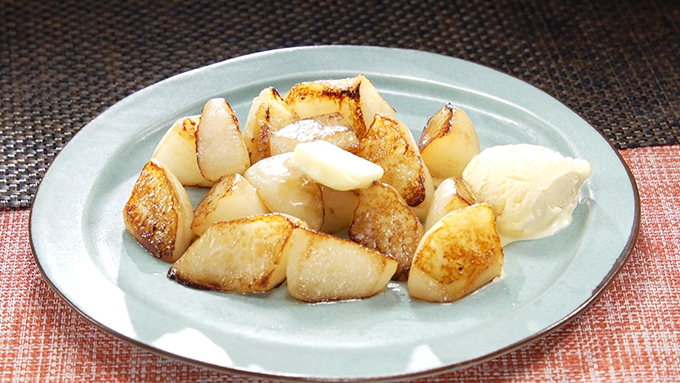 時々裏返して焼け具合を確認しながら5分ほど焼く。 - 梨に火が通ったら全体に砂糖をまぶし、アルミホイルを被せて再び5分ほど焼く。