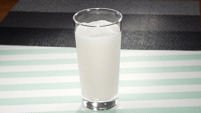 - ミキサーに冷凍した梨、牛乳を入れて撹拌する。