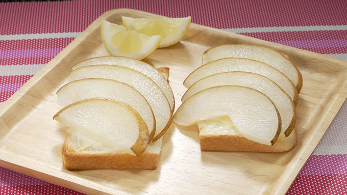 - 梨は皮をむいて芯を取り、ひと口大に切る。