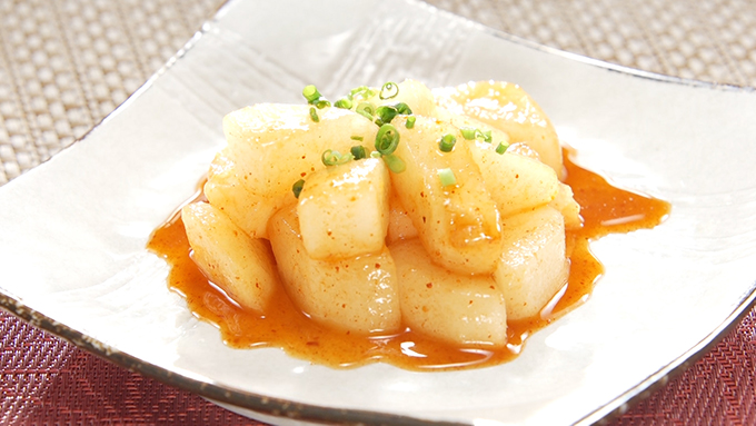 - 密閉袋に梨、キムチの素を入れ、冷蔵庫で1時間ほど漬ける。