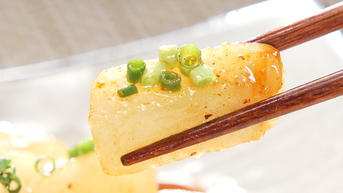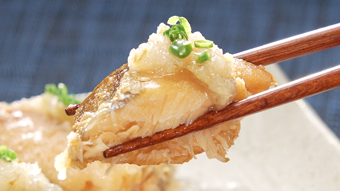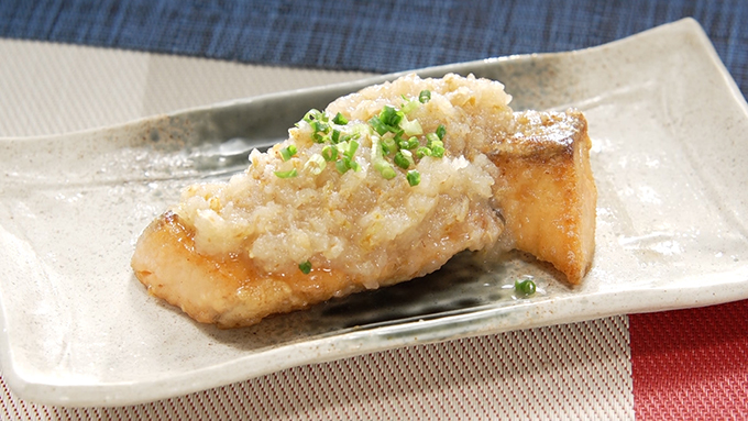 溶けたバターをスプーンで鮭にかけながら両面こんがりと焼く。 - 器に盛り、梨醤油をたっぷりかけ、お好みで小口切りした青ネギをのせる。