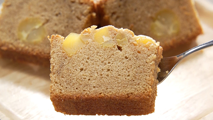 バターを薄く塗って、薄力粉を振った型に流す。 - 甘露煮を押し込むようにして生地の上に並べ、